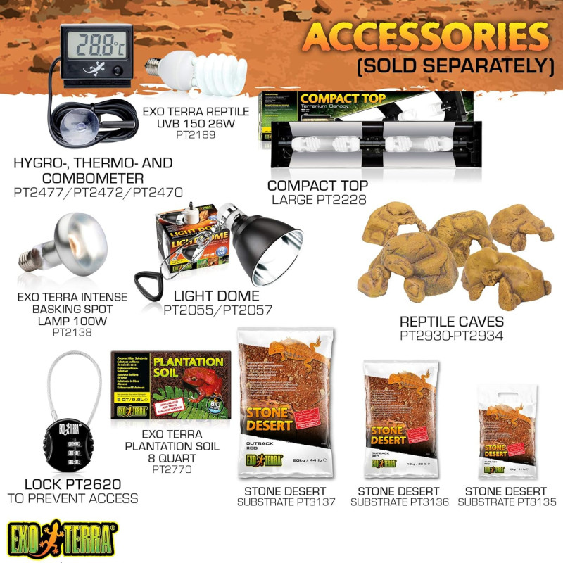 The Exo Terra Glass Terrarium is the ideal solution for reptiles and amphibians, designed by European herpetologists. The front-opening doors allow easy access for maintenance and feeding. A specially designed lock prevents escapes, and the doors can be opened separately. The full-screen top ventilation allows UVB and infrared penetration and is completely removable for easy decorating or cleaning. At the back of the screen top, there are 5 closable wire or tube inlets on both sides to install Heat Wave Rocks, waterfalls, sensors, etc., inside the terrarium. The bottom plate is raised to accommodate a substrate heater and warm up a larger portion of the ground surface. The extra-high fixed front window is ideal for thick layers of substrate (for burrowing reptiles), aquatic sections (paludarium), or for installing an Exo Terra reptile den. The natural background matches the color of many other Exo Terra decorative items (water dishes, waterfalls, Heat Wave Rocks, etc.) and provides additional climbing space.